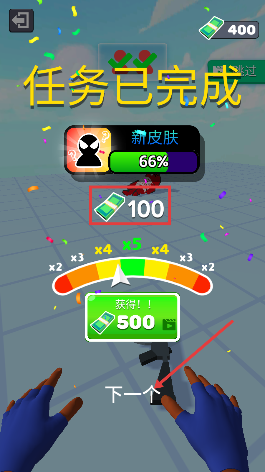 4、任务完成后,领取【100】货币,点击【下一个】进入新关,积累资源推进【新皮肤】解锁进度。