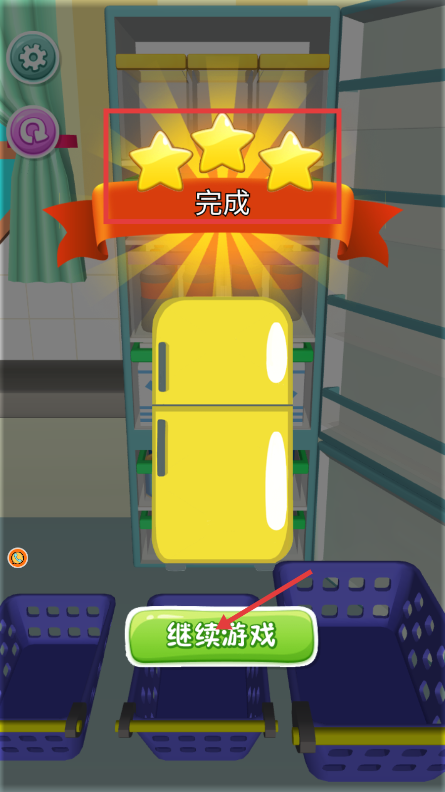 4、收纳完成获【三星-完成】评价,点击【继续游戏】,解锁新关卡或内容,积累经验。