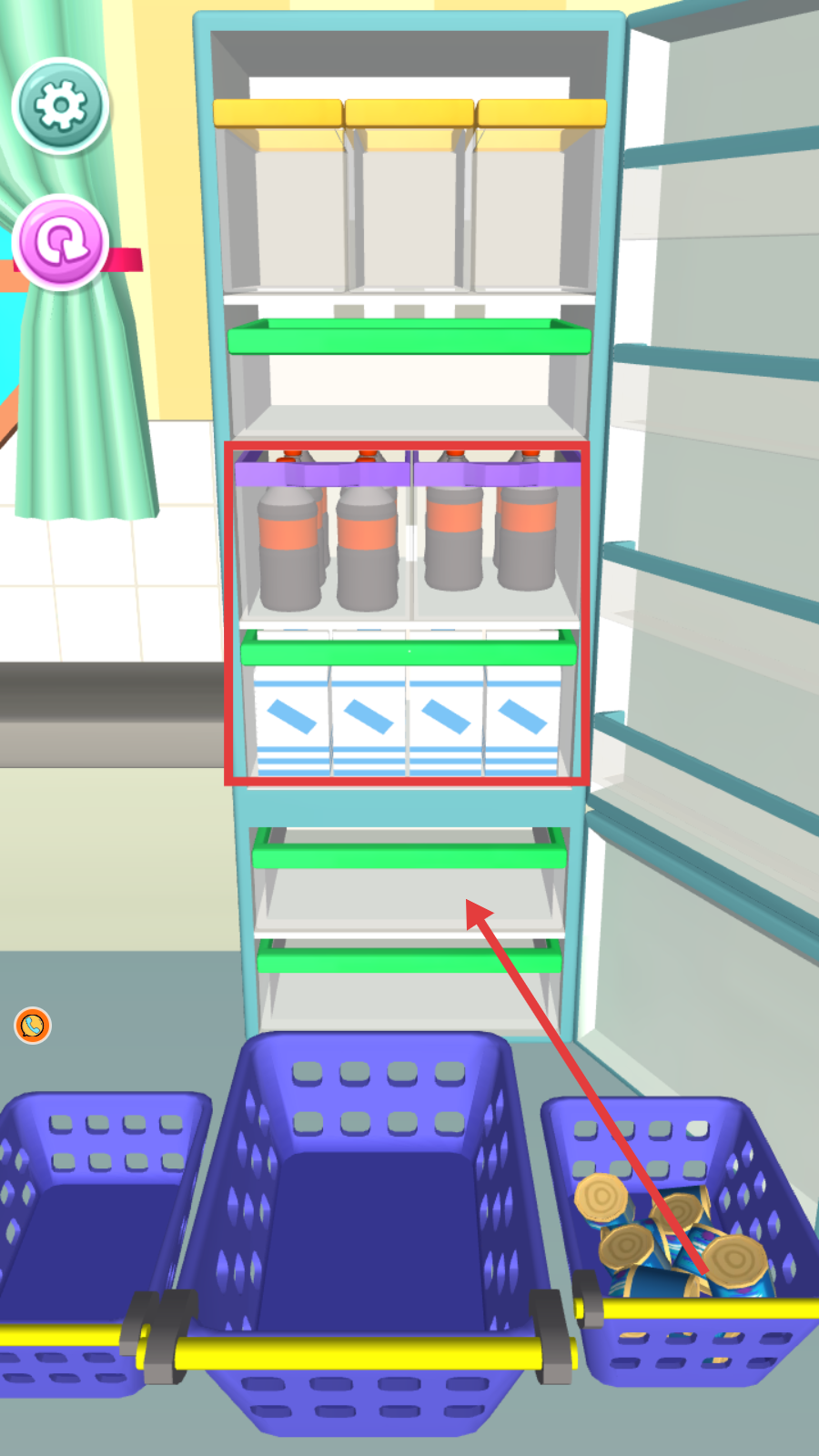2、关卡内将红色瓶盖饮料瓶,从篮子移入冰箱上层对应区域,逐步完成收纳任务。