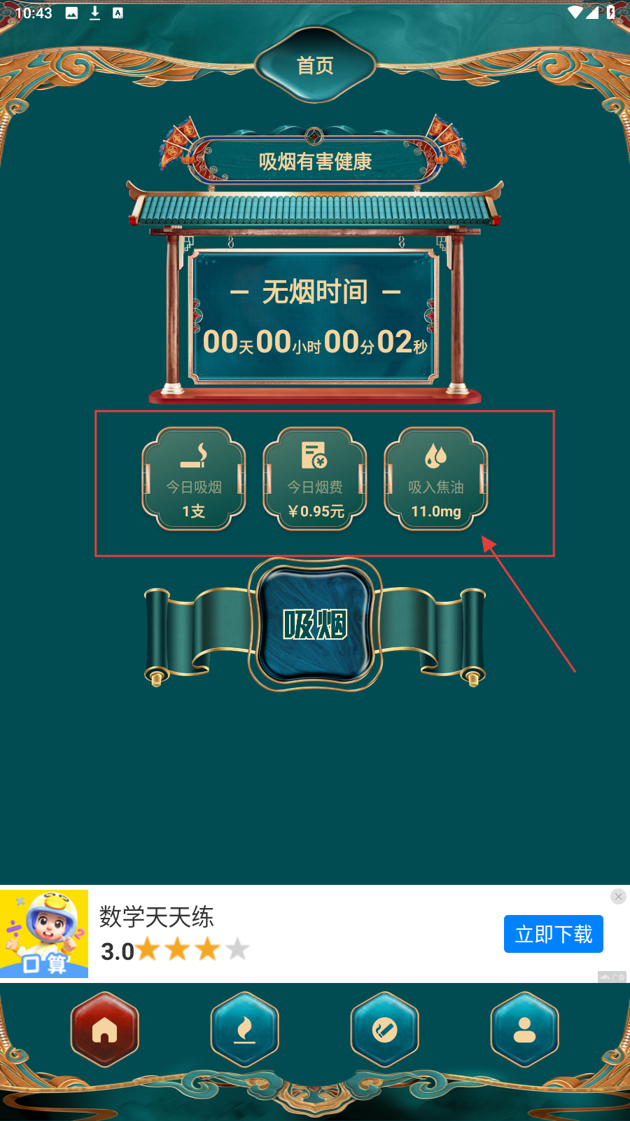 3、打卡后,在主页面中的今日吸烟、今日烟费等数据会同步更新。