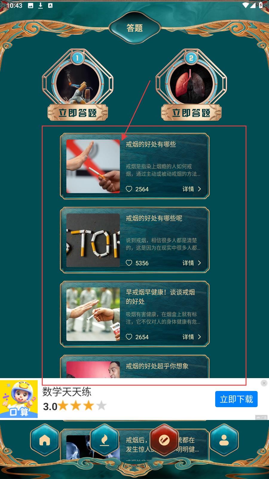 4、还可以进入【答题】页,浏览戒烟知识内容,学习戒烟好处助于戒烟。
