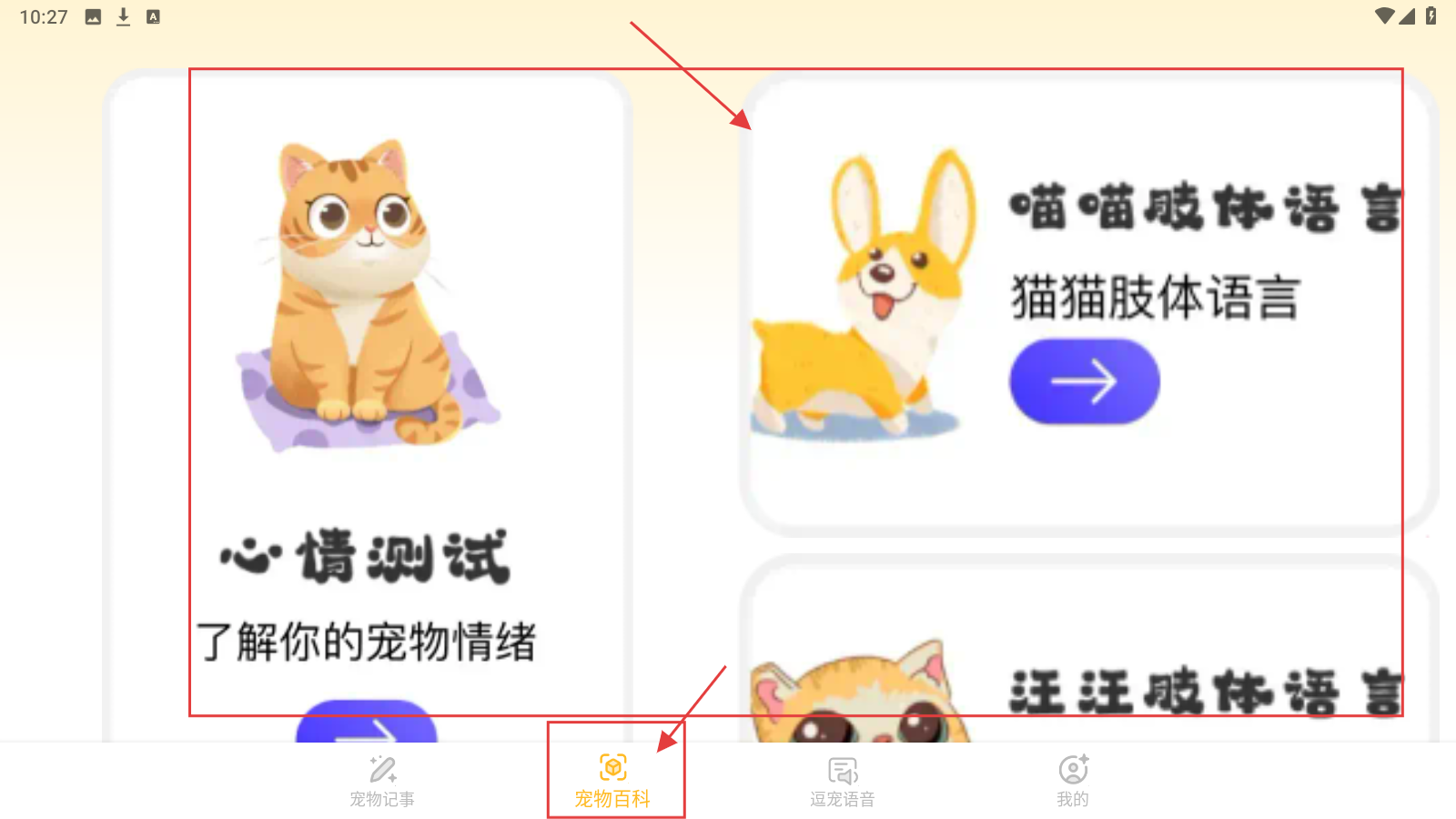 4、还可以切换至【宠物百科】页面,利用心情测试、喵喵肢体语言等按钮,深入了解宠物知识。