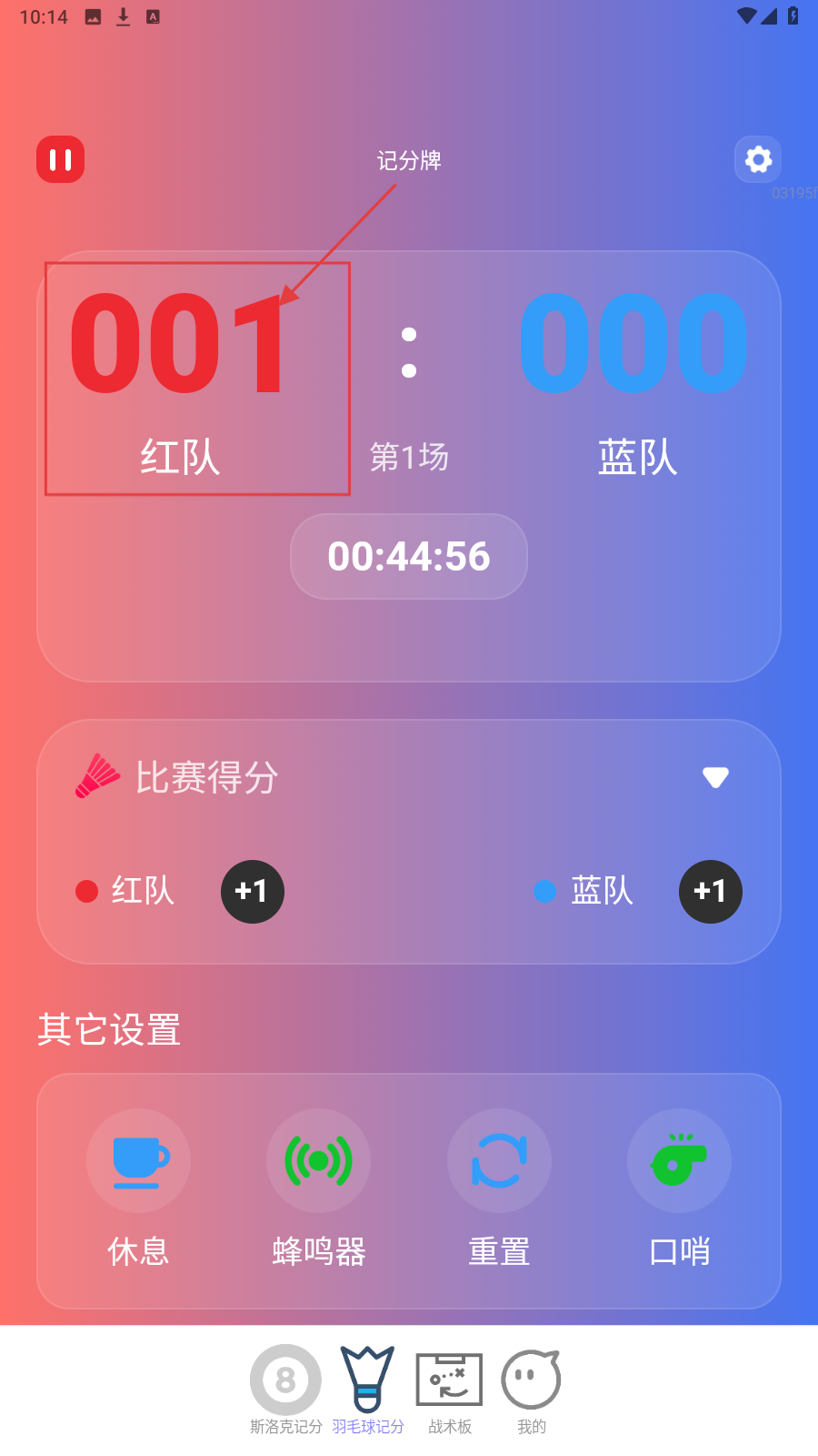2、如若得分,点击下方比赛得分栏,在对应队伍下点击【 1】按钮。