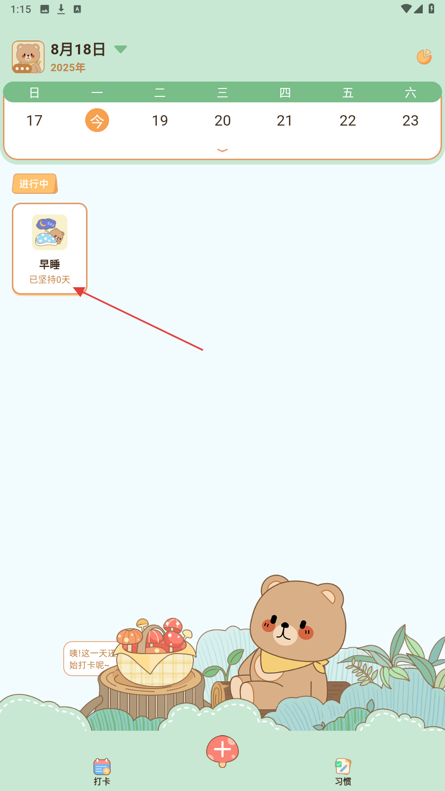 4、保存后回到打卡页,能看到新建的习惯卡片(如【早睡-已坚持0天】),开始打卡。