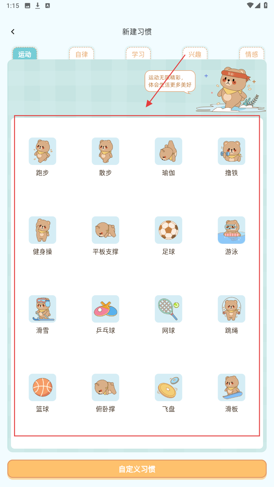 2、到新建习惯页,选运动类(如【跑步】【瑜伽】)或其他分类习惯,确定想养成的。