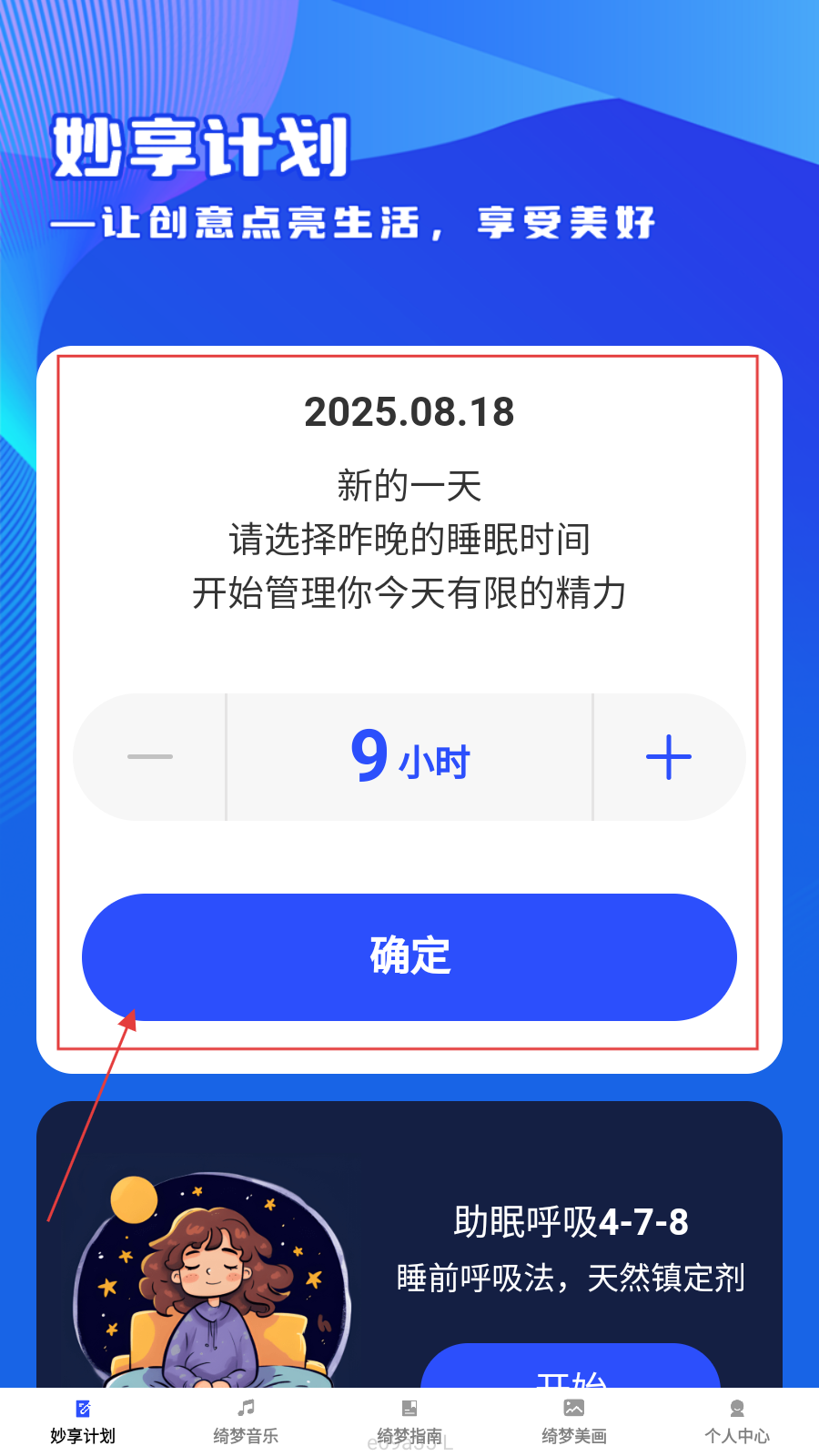 1、进入【妙享计划】页面,选昨晚睡眠时长(默认9小时可调整),点【确定】开启精力管理。