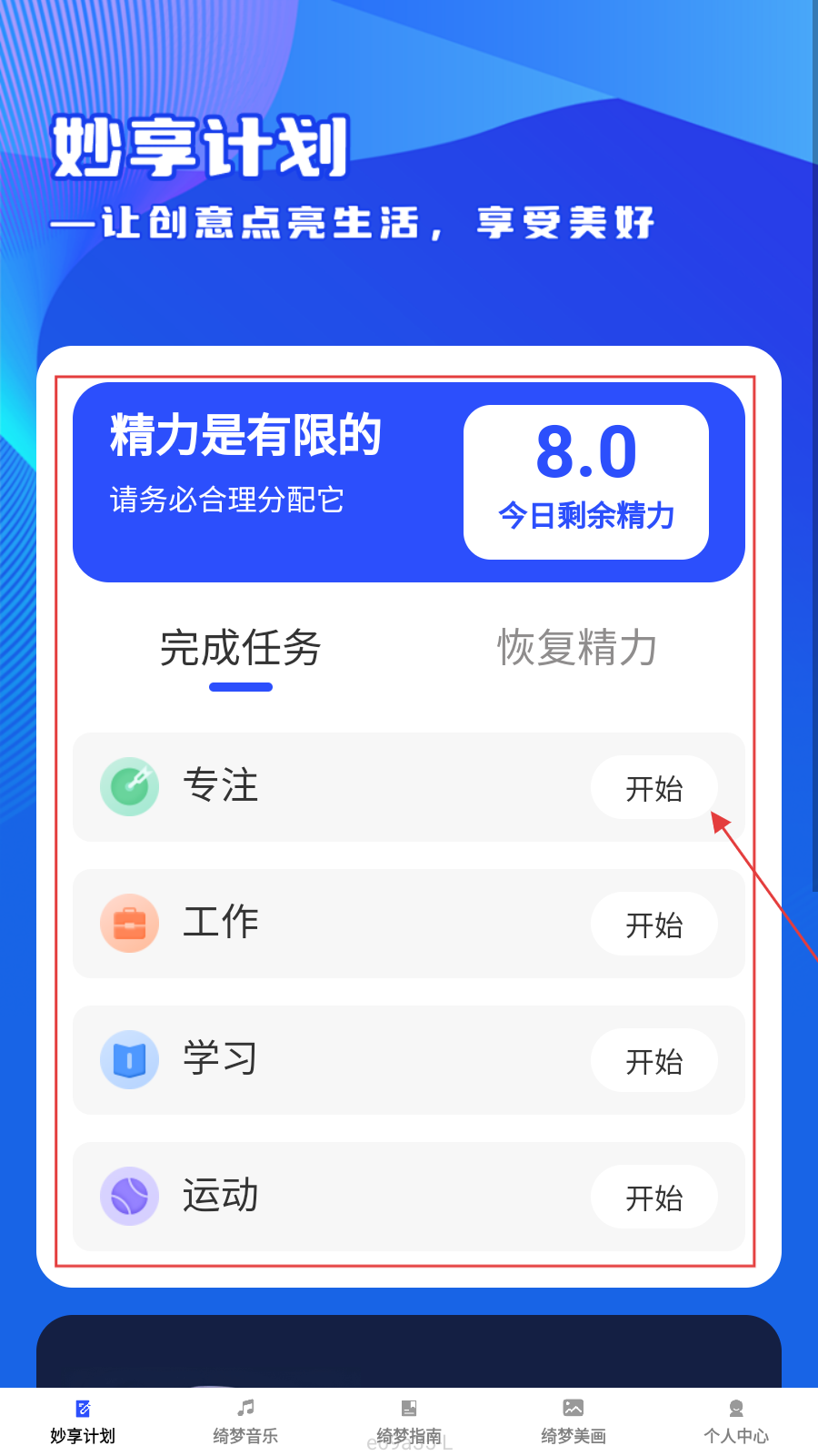 2、在精力页,选任务(如【专注】)点【开始】,按任务类型分配今日精力。