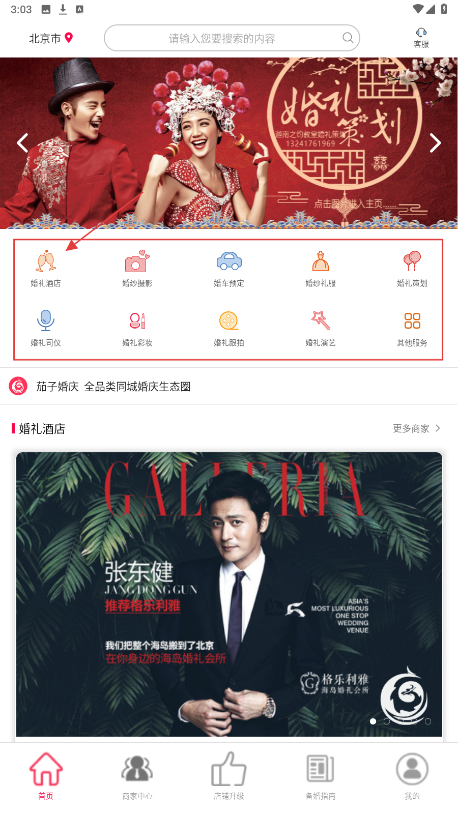 1、进入首页选【婚礼酒店】等分类,快速锁定婚庆服务类型。