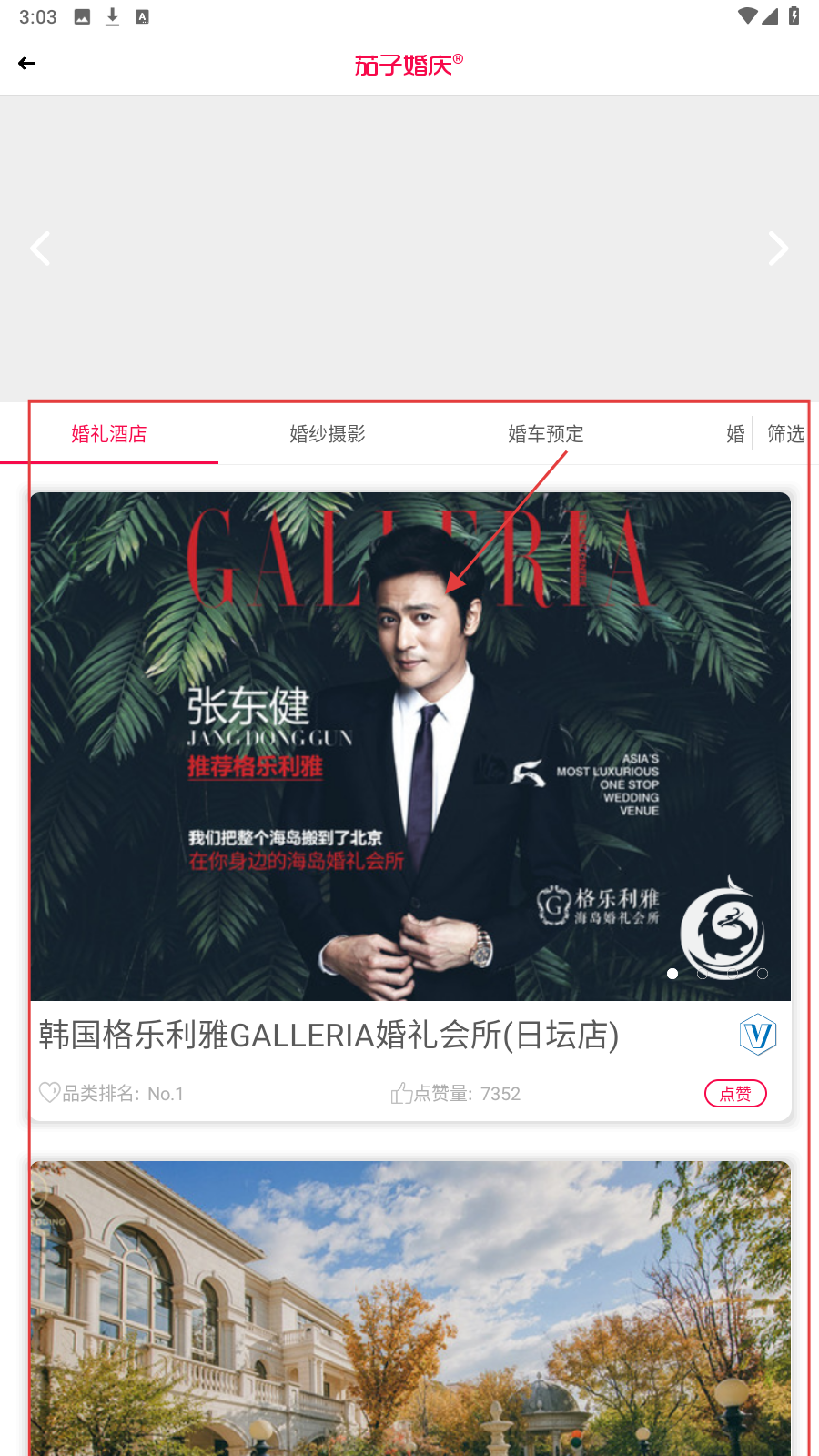 2、在【茄子婚庆】专区,切换【婚礼酒店】标签找心仪场地。