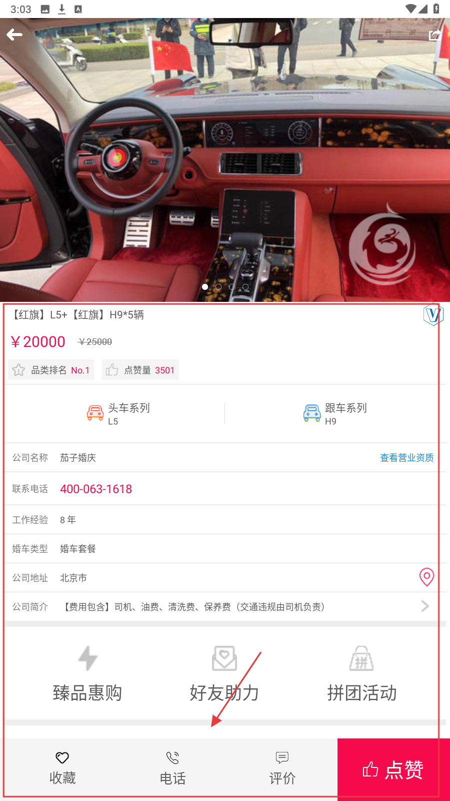 4、还可以选择婚车服务看套餐,点【电话】沟通,确认车辆与费用信息。