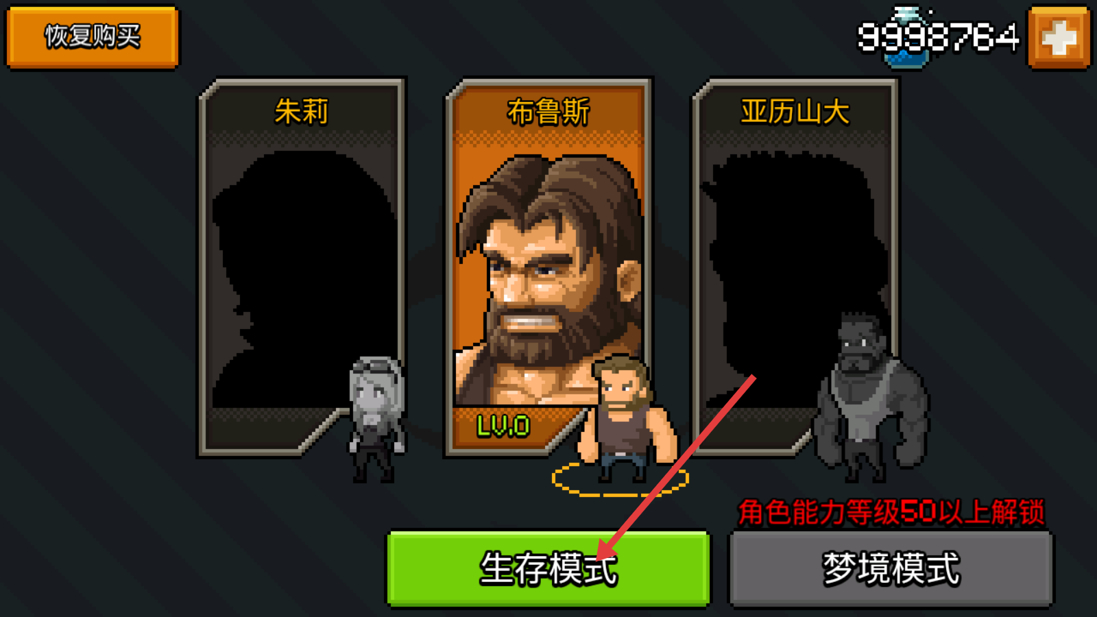1、选择【布鲁斯-Lv.0】角色,点击【生存模式】开启冒险,朱莉与亚历山大需等级解锁。