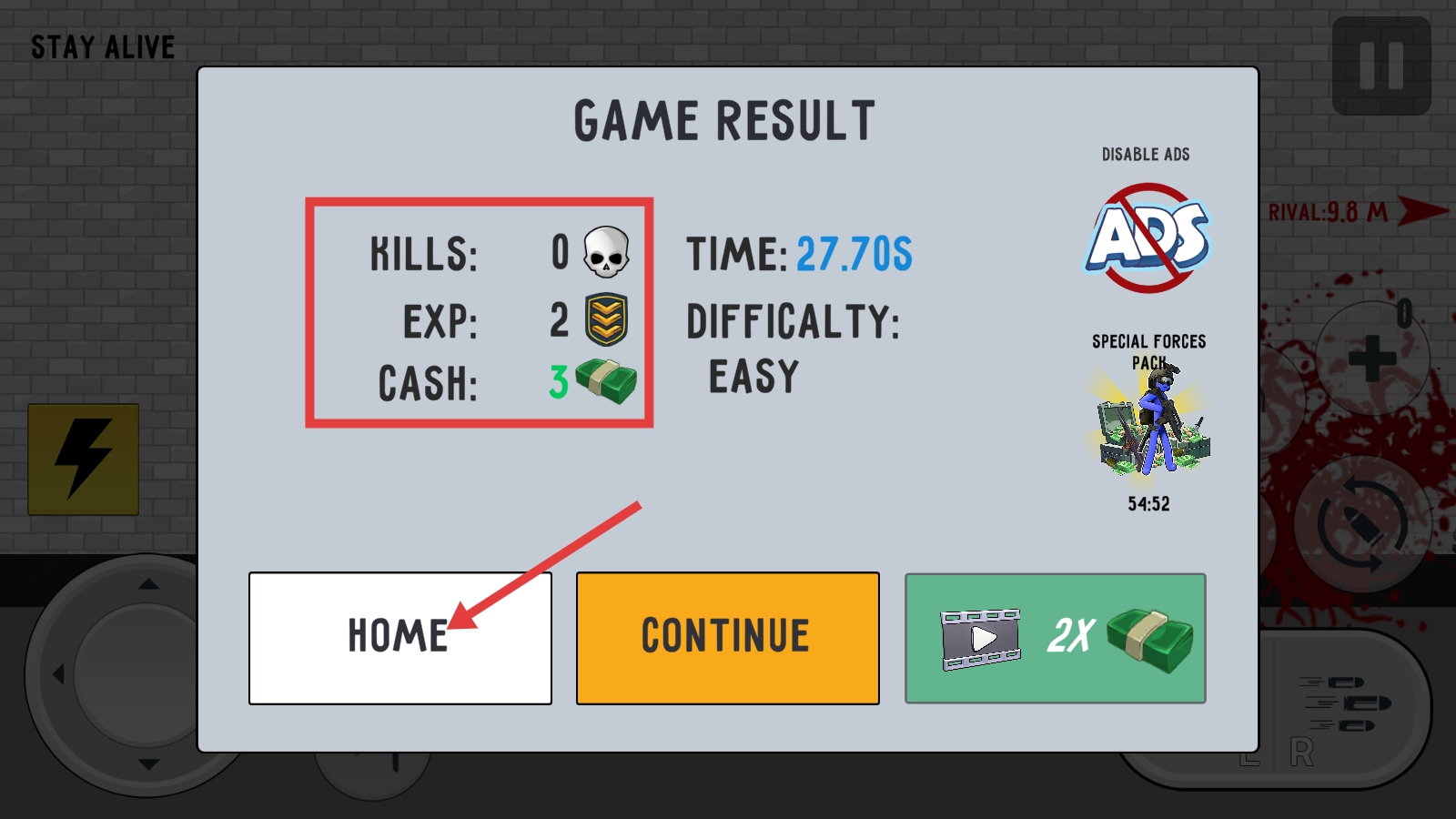 4、战斗结束查看【KILLS-0】【EXP-2】【CASH-3】结算数据,点击【HOME】返回主界面。