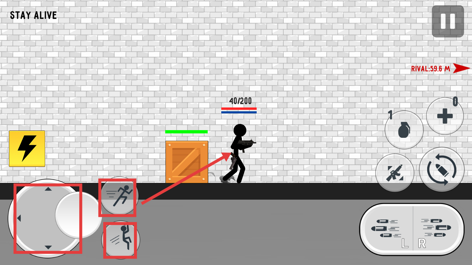 2、战斗中通过左侧摇杆控制移动,点击奔跑、跳跃按钮,借助木箱掩体规避敌方攻击。