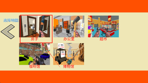 3、选择场景:在场景选择界面,点击不同的场景图标选择游戏地图,例如选择“房子”。
