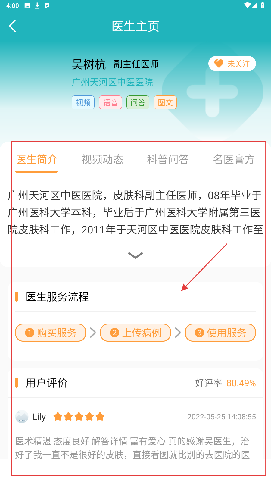 4、医生主页查【服务流程】,按购买-上传-使用步骤完成问诊。