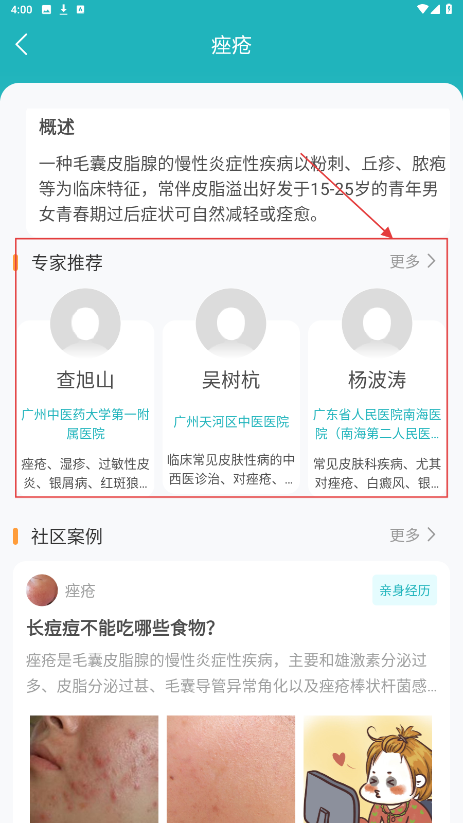 2、在病症页看【专家推荐】,点击【更多】进入专家列表。