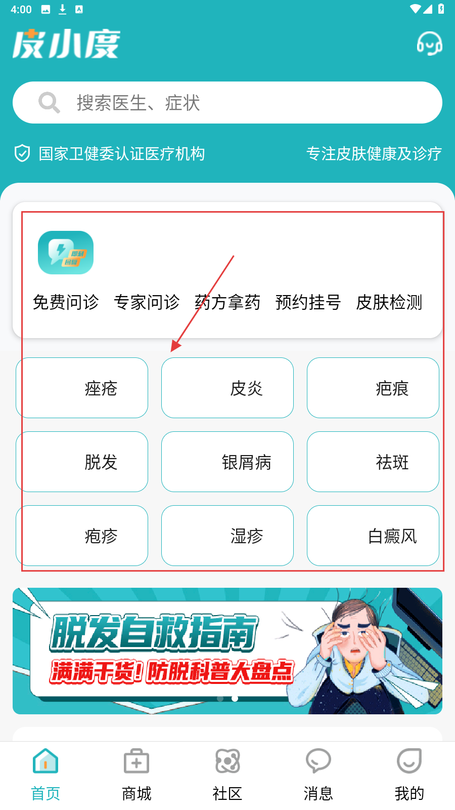 1、打开APP选病症(如痤疮),进入对应病症页面找诊疗入口。