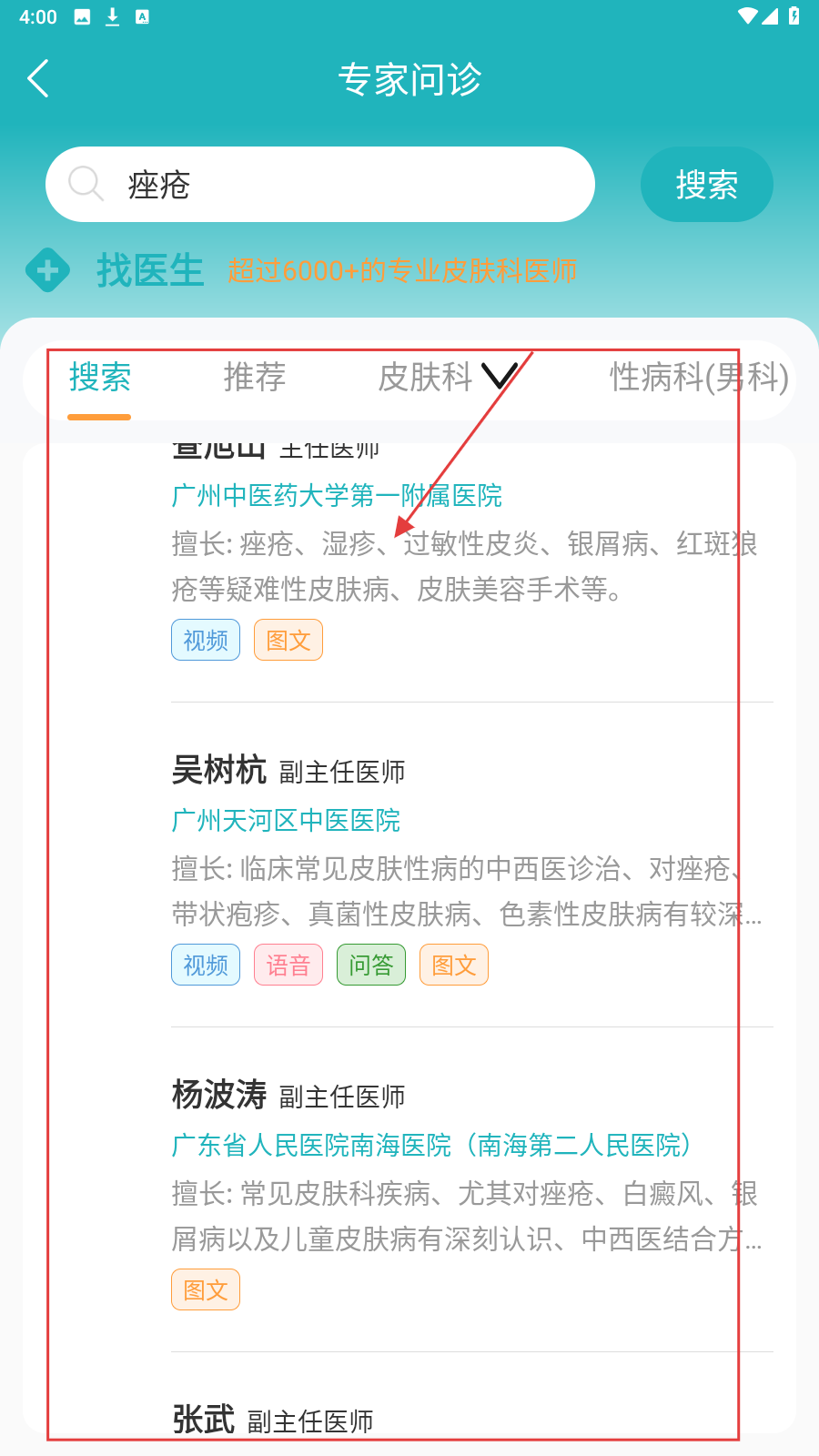 3、进入【专家问诊】页,筛选擅长对应病症的医生预约咨询。