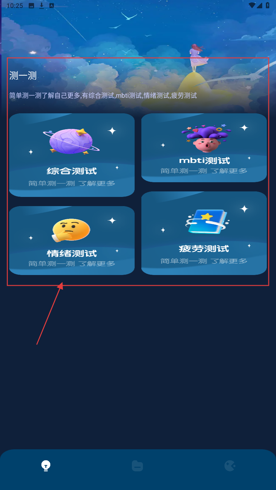 1、进入主界面,想了解自己可点【综合测试】【mbti测试】等功能,选对应测试探索自我。