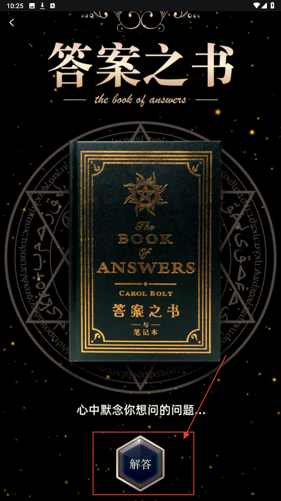4、使用【答案之书】先默念问题,再点下方【解答】按钮,获取对应答案指引。