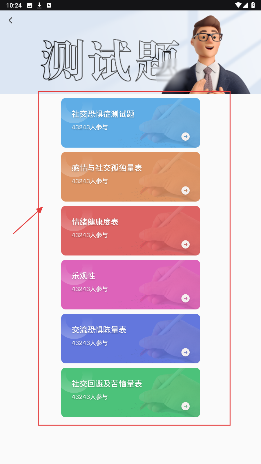 3、测试题页面有社交恐惧等量表,选感兴趣的【社交恐惧症测试题】等,参与测试了解自身。