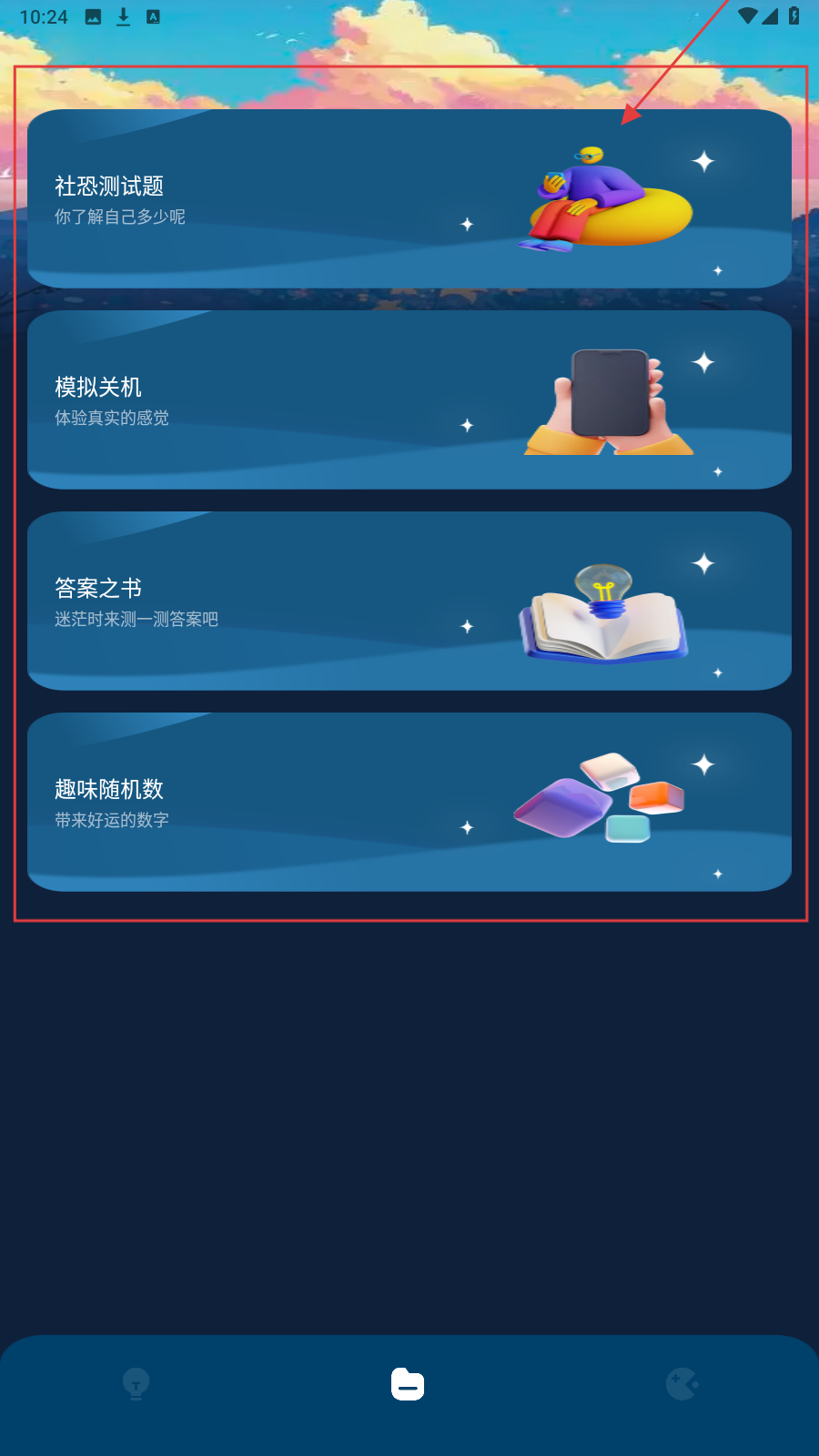 2、切换页面有【社恐测试题】【模拟关机】等功能,按需点击体验,如好奇社恐程度点社恐测试题。