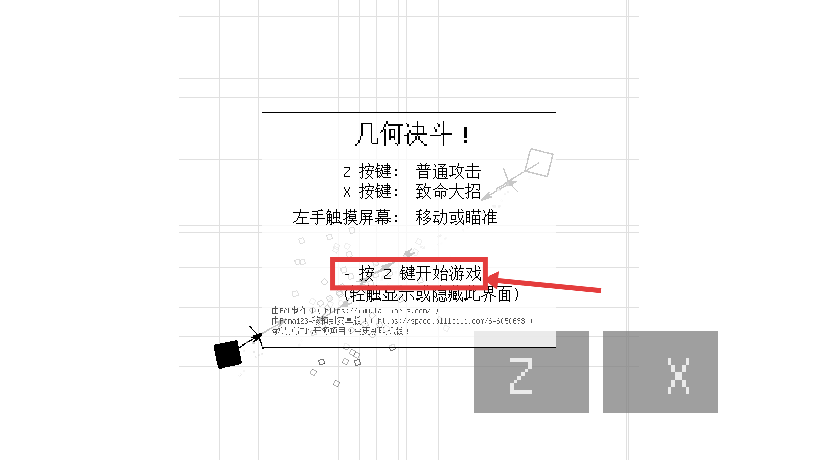 1、进入【几何决斗】,按【Z键】启动游戏,左手触控负责移动或瞄准,先熟按键规则。
