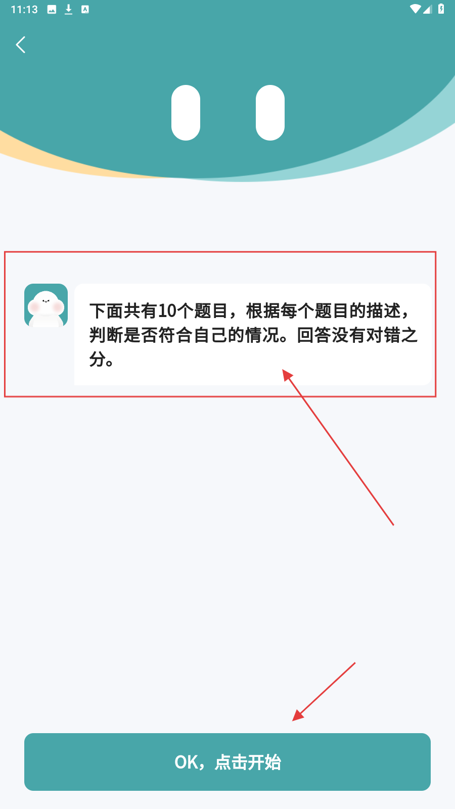 4、阅读10题答题说明,点【OK,点击开始】,按自身情况如实作答完成测评。