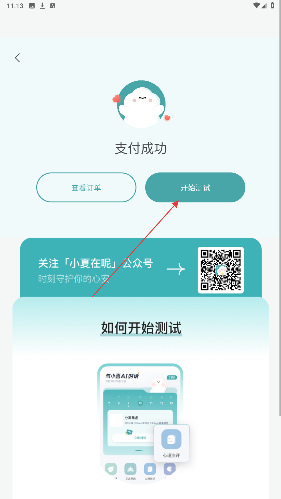 3、支付成功后,点【开始测试】按钮,进入核心自我评价测评流程。