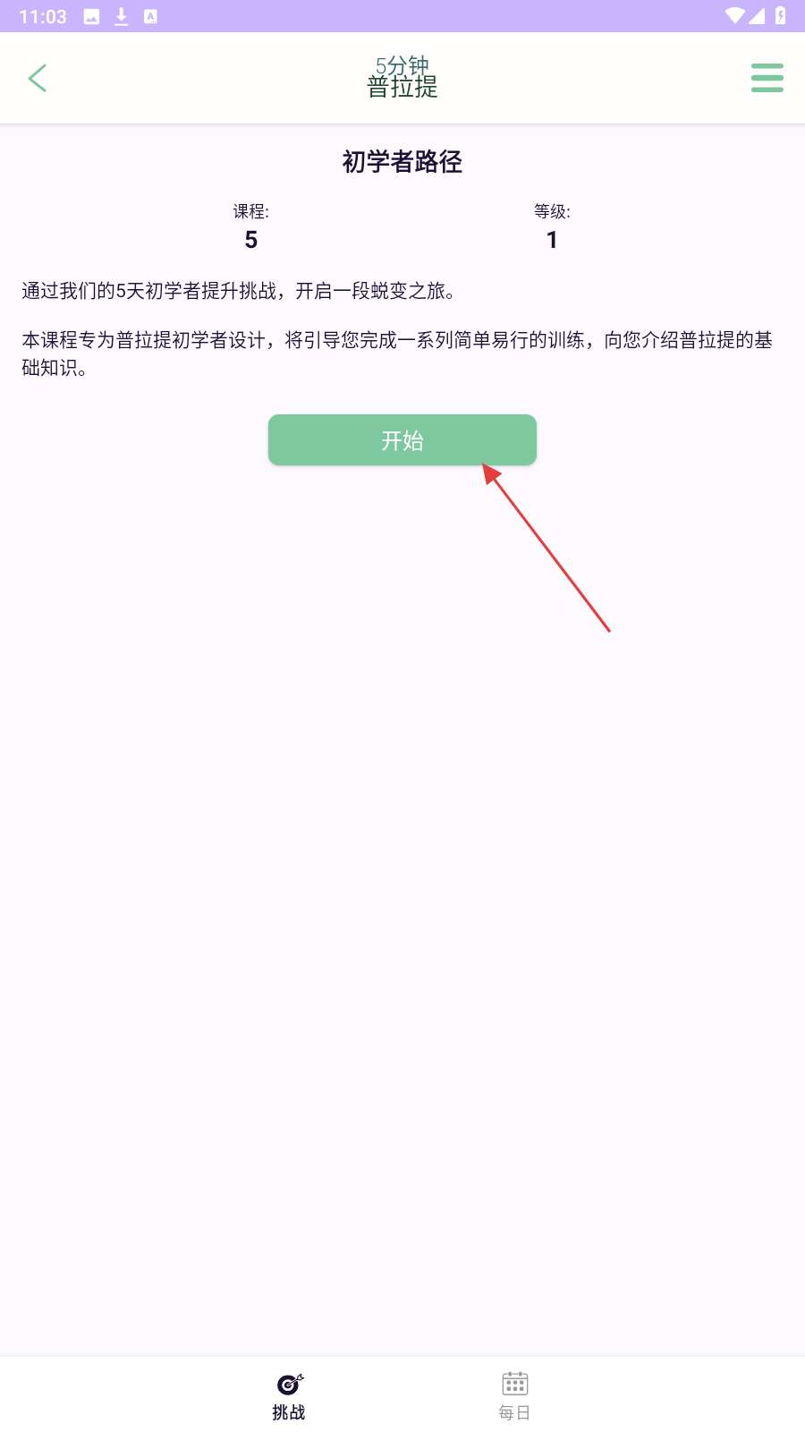 1、打开应用选【初学者路径】等挑战,点右侧【开始】,开启对应普拉提训练。