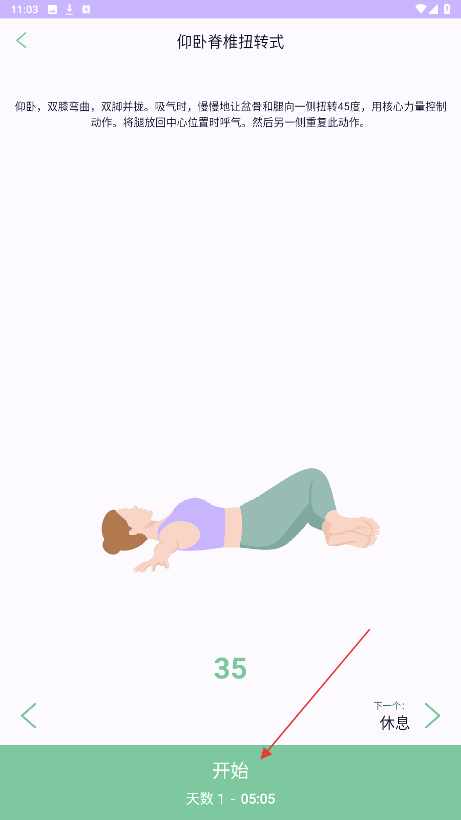4、到仰卧脊椎扭转式页面,看清动作说明,点【开始】按钮,按35秒计时跟练。