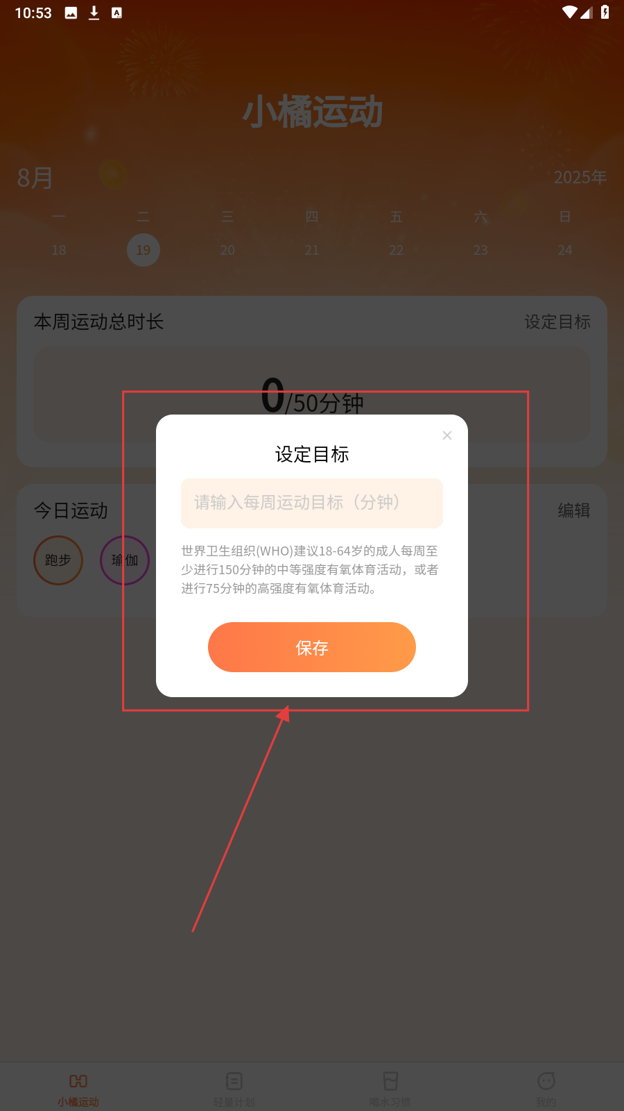 2、在设定目标弹窗,输入每周运动目标分钟数,参考WHO建议值,点【保存】确认。