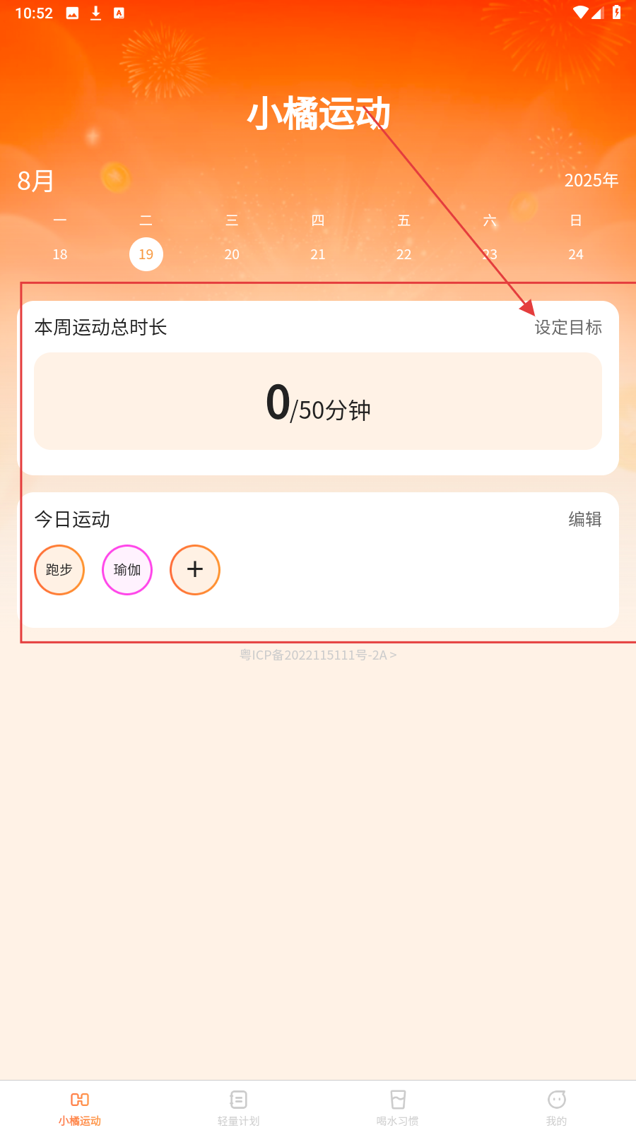 1、进入首页,点【设定目标】可自定义每周运动时长,规划健身任务。