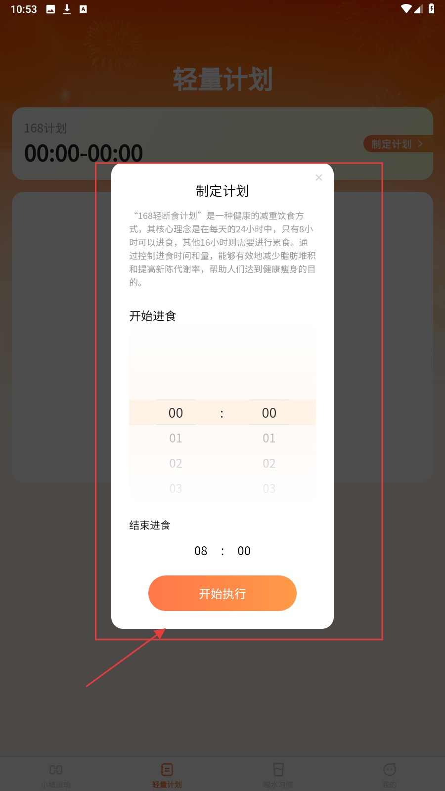 4、制定轻断食计划时,选开始、结束进食时间,确认后点【开始执行】,开启计划。