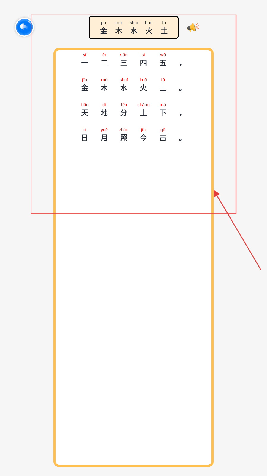 2、在指读页面,跟读【金木水火土】内容,练习拼音与汉字认读。