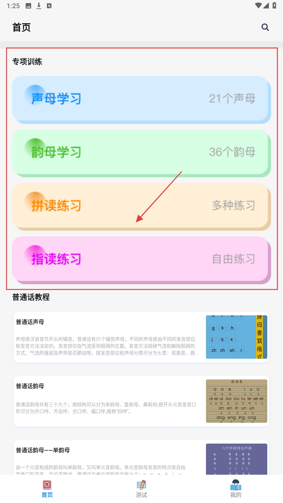1、首页选【指读练习】,进入自由练习模式,开启拼音指读训练。