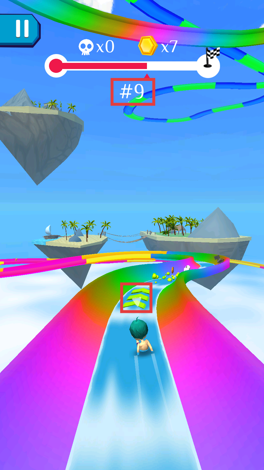 2、滑行时踩中【绿色加速带】提升速度,沿彩虹滑道前进,收集沿途六边形道具。