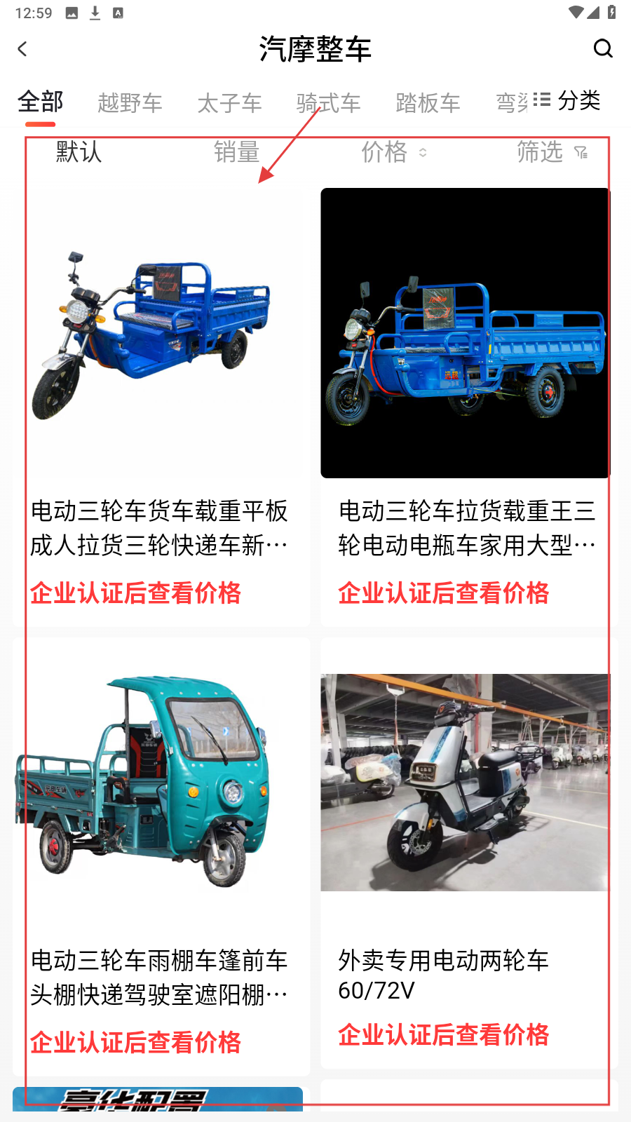 3、进入【汽摩整车】分类,浏览车辆列表,筛选心仪电动三轮车。