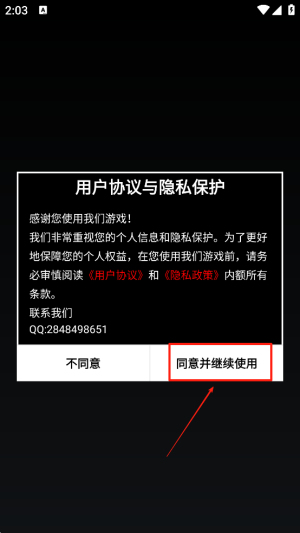 1、同意协议:阅读用户协议与隐私保护内容,点击“同意并继续使用”以接受条款并开始游戏。