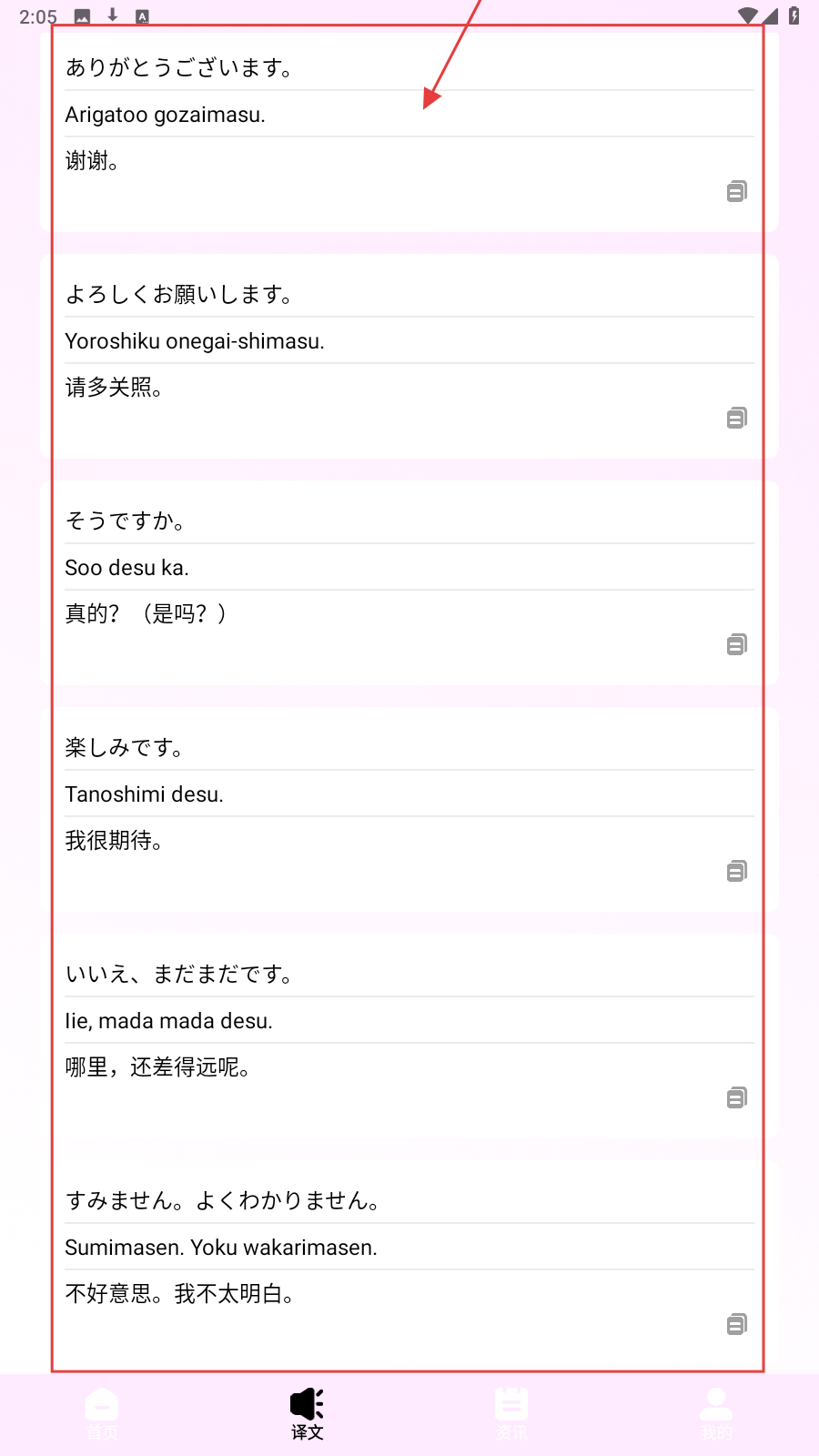 2、切换【译文】页,记常用日语短句,积累表达。