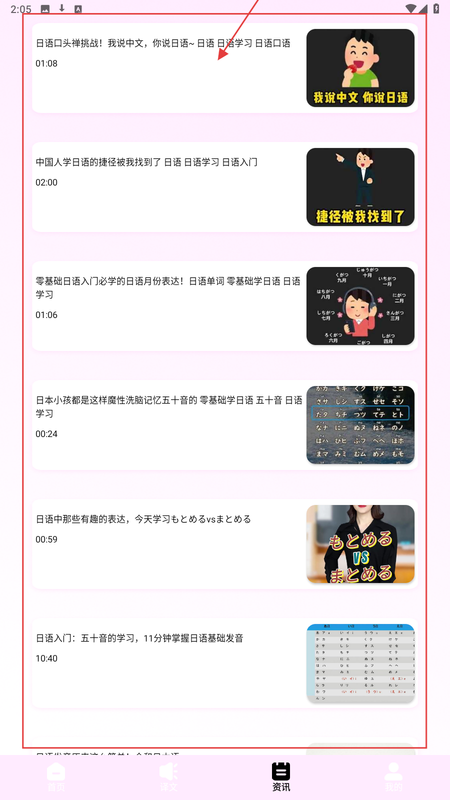 3、进入【资讯】页,选趣味内容,如【日语口头禅挑战】,练口语。