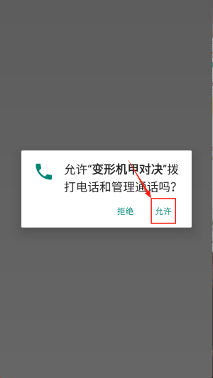 2、授权权限:当系统询问“允许‘变形机甲对决’拨打电话和管理通话吗?”时,点击“允许”完成授权。