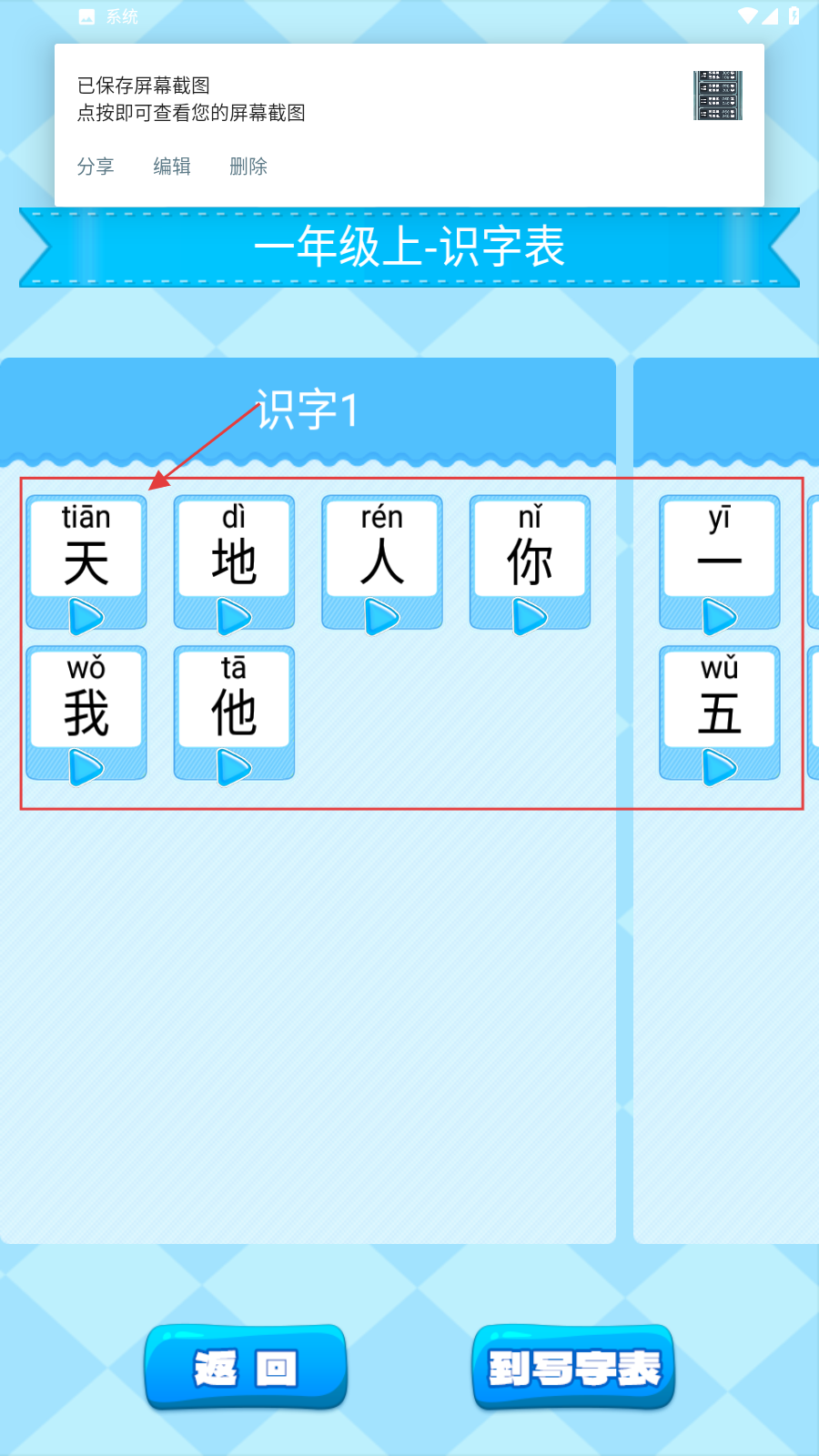 2、在【一年级上-识字表】,点【天】【地】等生字卡片,学习拼音与字形。
