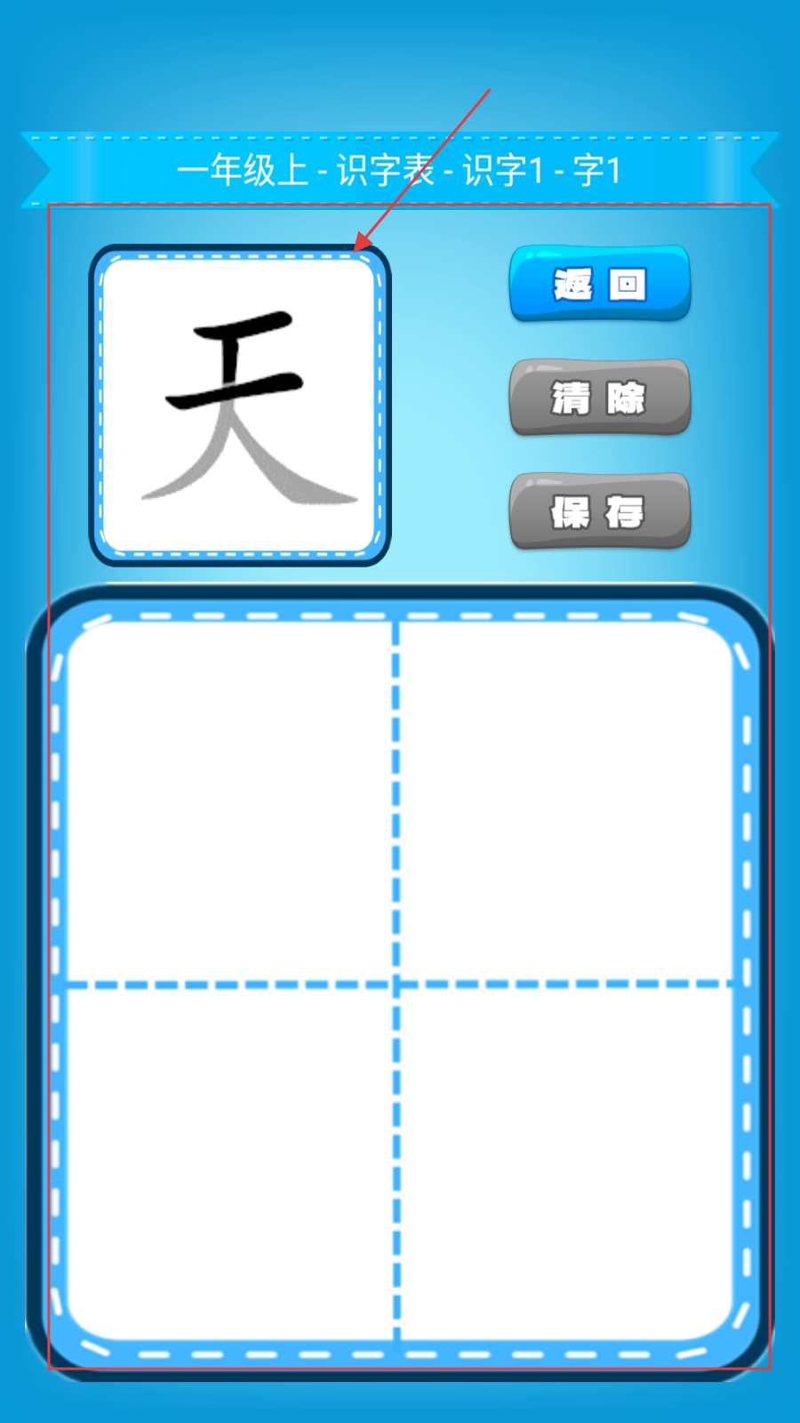 4、进入书写页,按【天】字范例,在田字格练字,点【保存】留存书写成果。