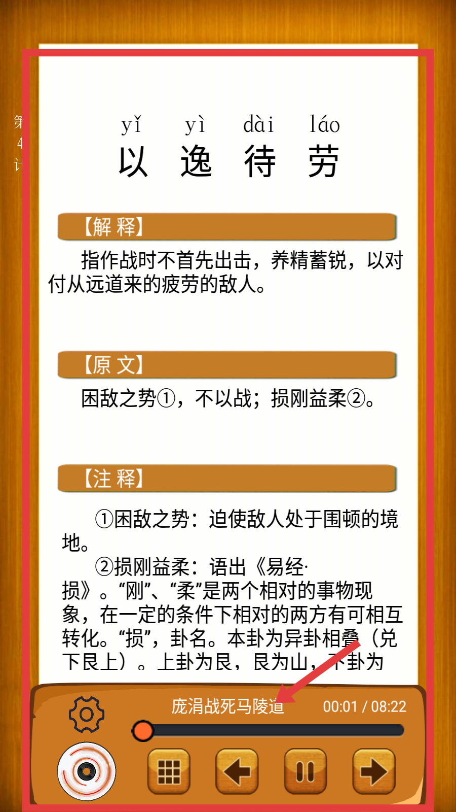 4、在详情页,点底部【庞涓战死马陵道】音频,听对应故事。