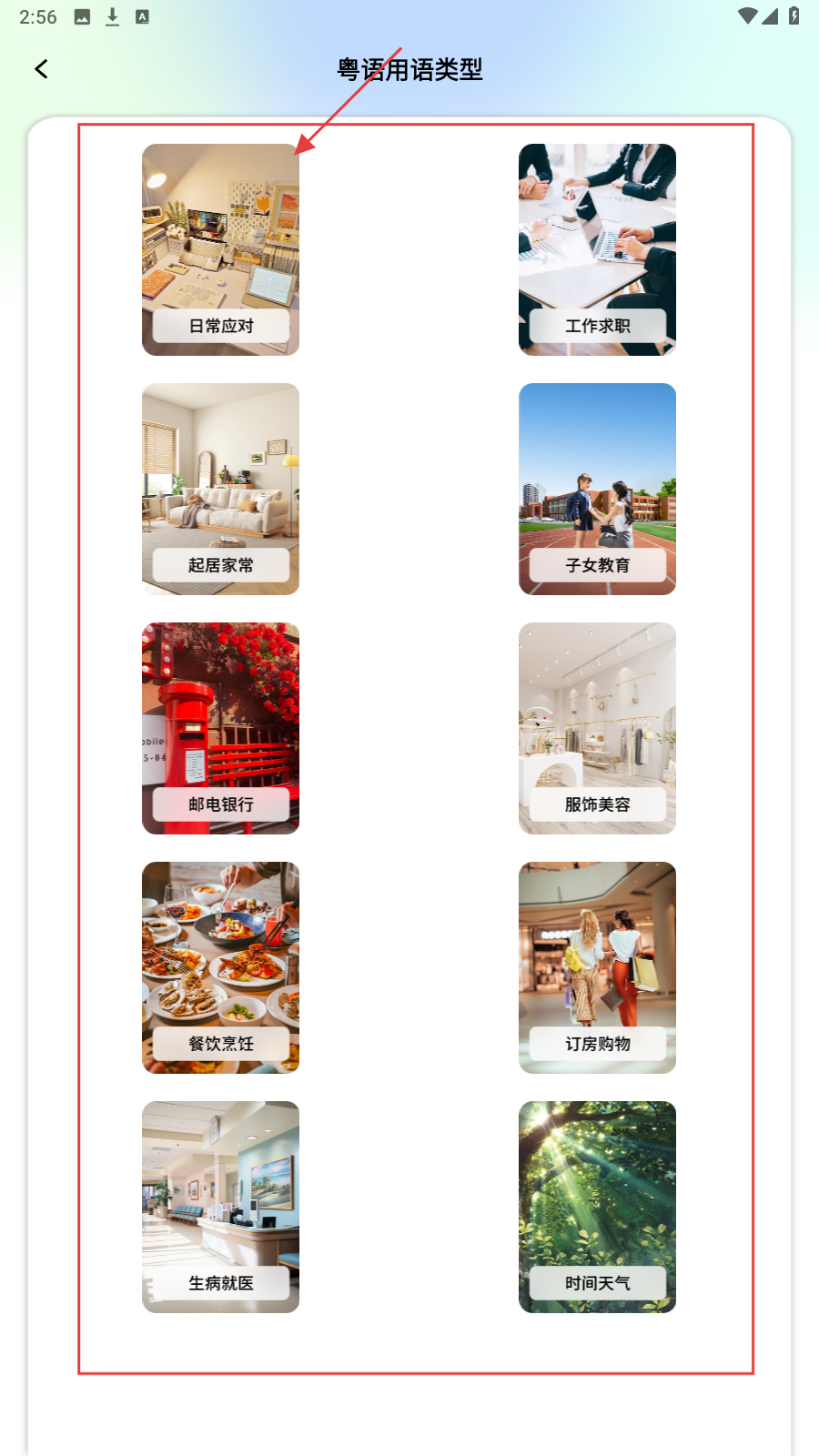 1、进入首页,选【各类粤语用语】下场景,如【生活用语】学基础表达。