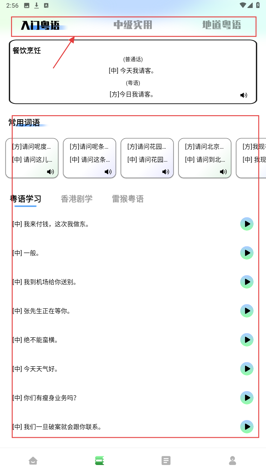 3、切换到学习页,选【入门粤语】标签,跟练【餐饮烹饪】等场景的粤语表达。