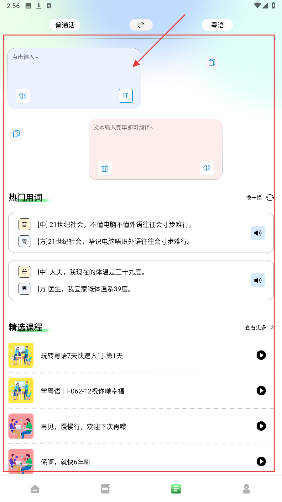 4、进入翻译页,输入普通话,点【译】转粤语,借【热门用词】和课程巩固学习。
