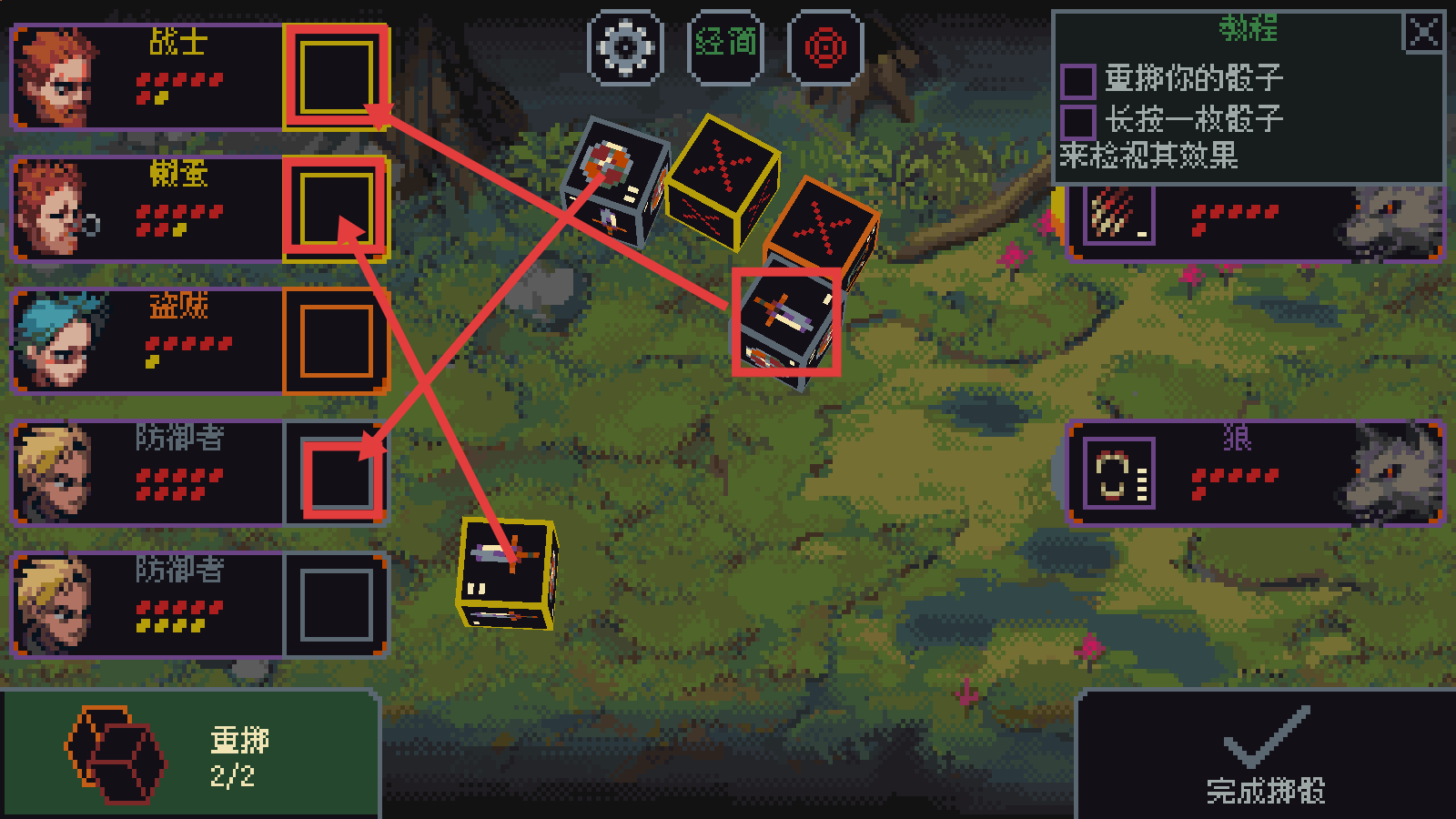 1、骰子策略博弈:每回合两次重掷机会自由调整骰面组合,决策保留攻击防御等关键面值创造战术优势空间。