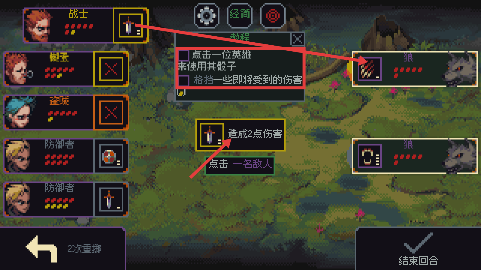 3、点击战士启用【造成2点伤害】骰子,选定敌方目标输出,高效削减敌人血量。